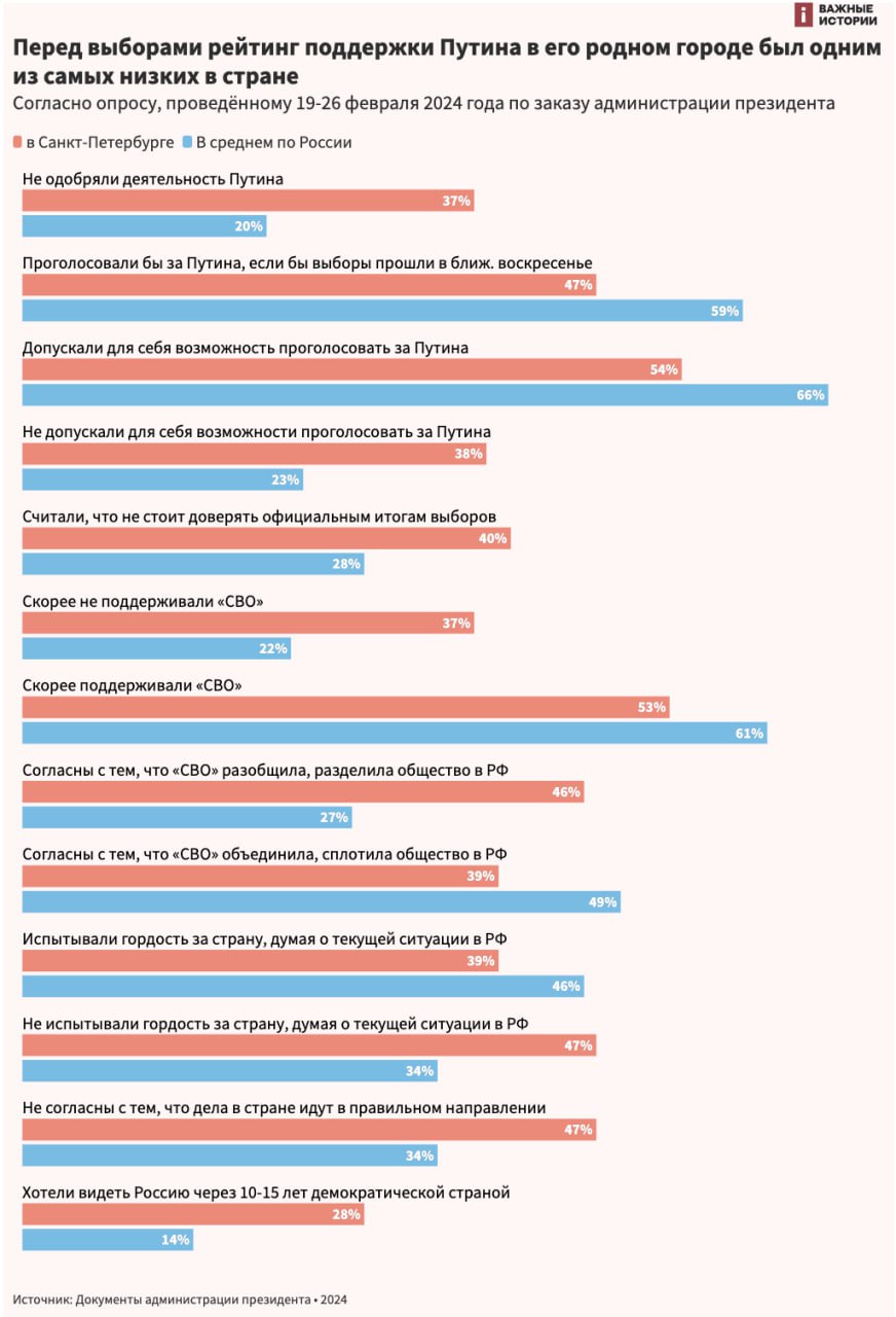 В феврале по заказу подконтрольной Кремлю АНО «Диалог» был проведен масштабный опрос более 44 000 респондентов. Людей спрашивали об отношении к «СВО», доверии Путину и гордости за страну. Результаты опроса предназначались для внутриполитического блока АП.