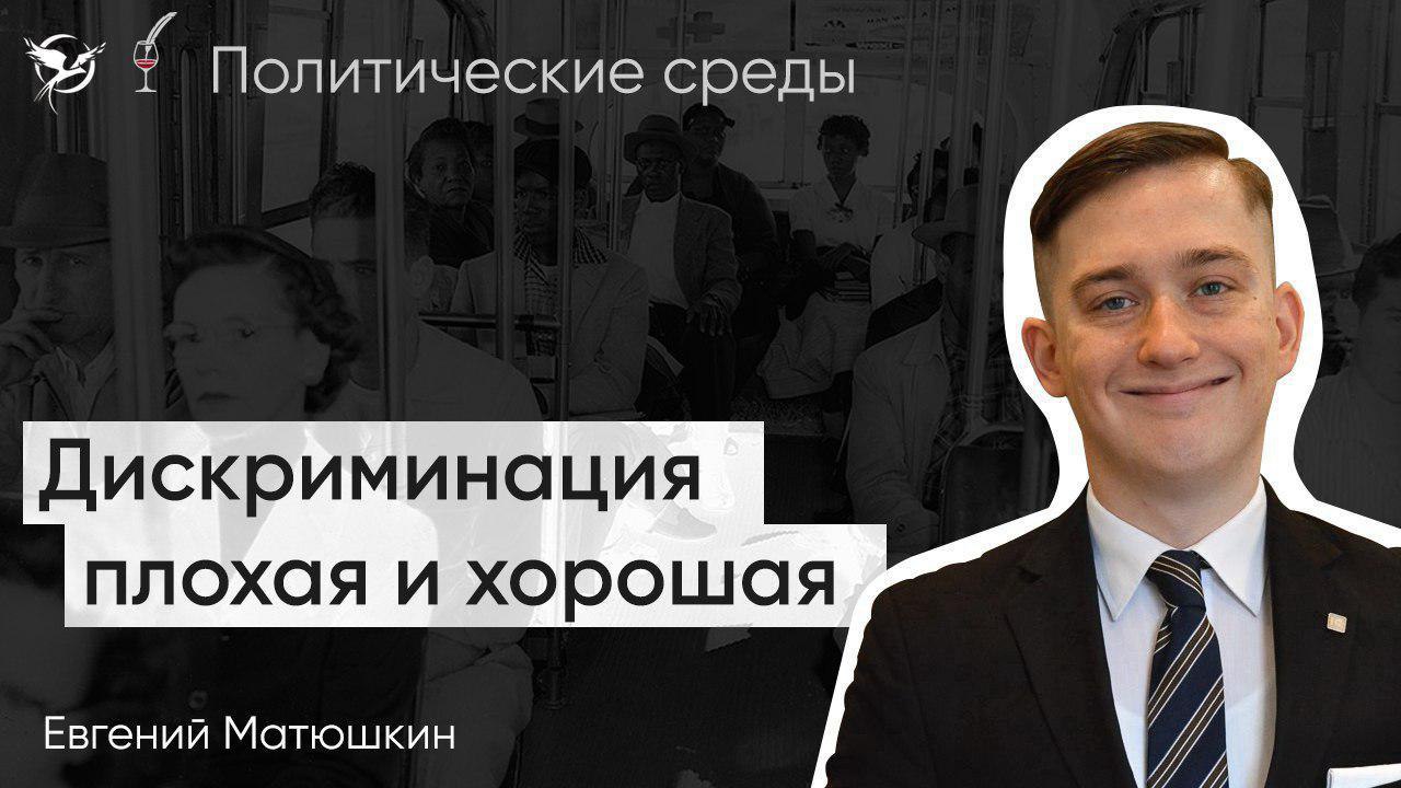 Дискриминация в разных ее проявлениях — частная и государственная, негативная и позитивная — станет следующей темой наших Политических сред, которые проведет член нашего отделения Евгений Матюшкин. Ждем вас!».