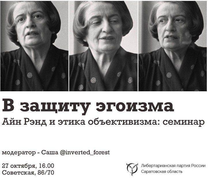 Саратовские либертарианцы приглашают вас на увлекательный семинар. В этот раз они предлагают обсудить Айн Рэнд и её философию.