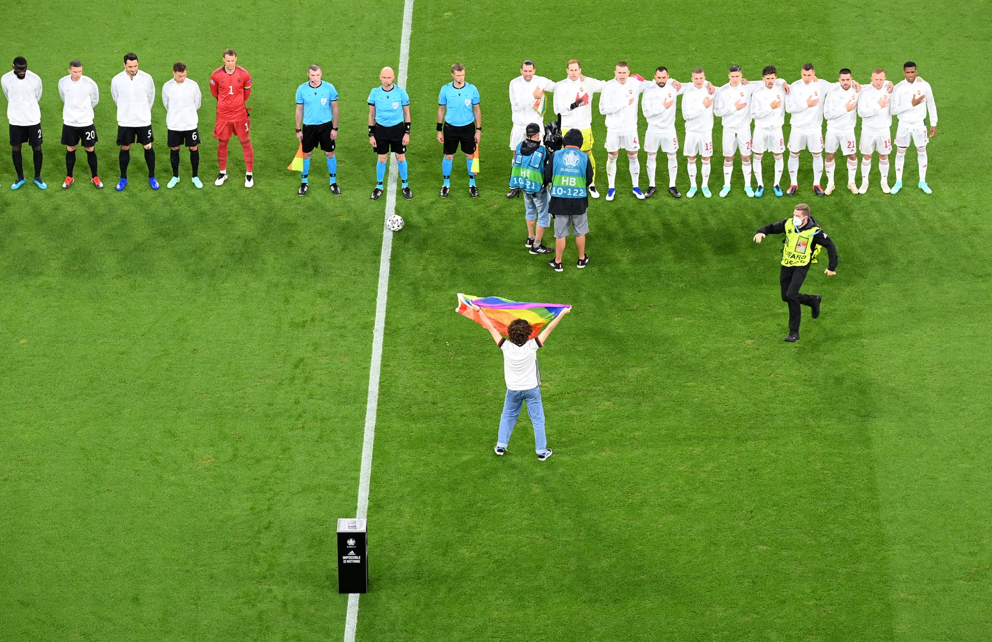 Перед вчерашним матчем между сборными Германии и Венгрии немецкие болельщики провели акцию в поддержку ЛГБТ. Когда венгерские футболисты исполняли государственный гимн, на поле стадиона «Альянц Арена» выбежал человек в футболке немецкой сборной и поднял перед спортсменами радужный флаг. Протестующего задержали.