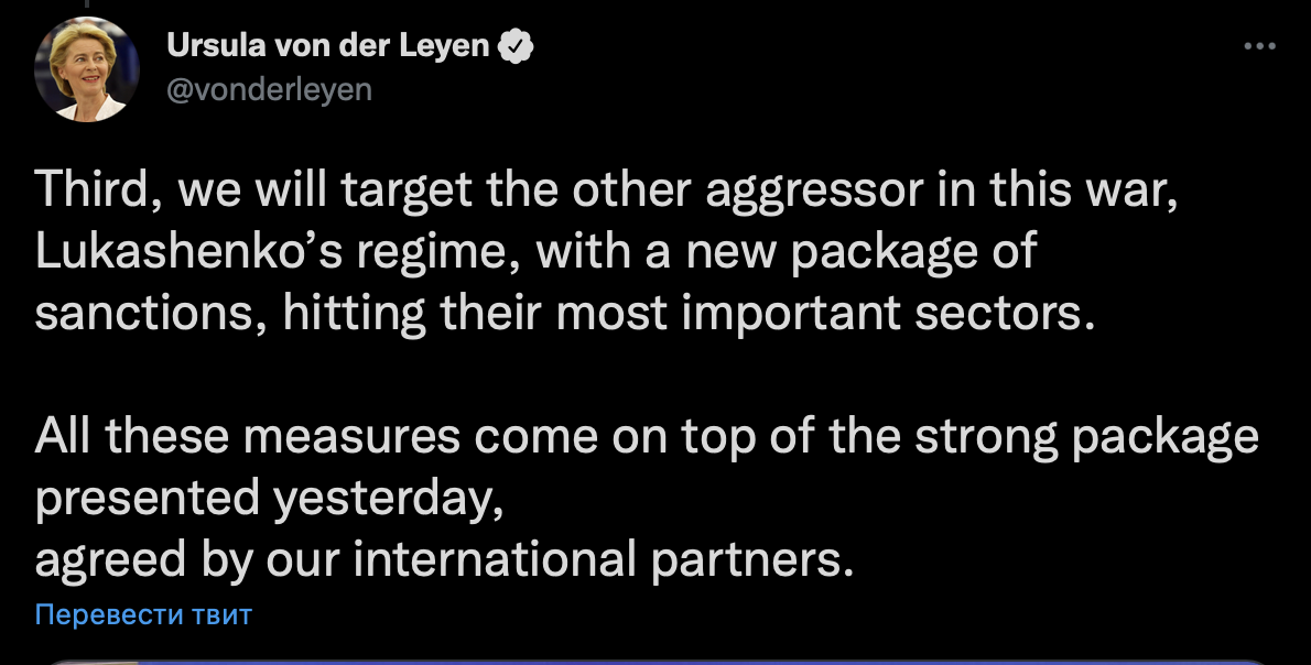 «Мы ударим по другому агрессору в этой войне, режиму Лукашенко, новым пакетом санкций, ударив по их наиболее важным секторам», - сообщила Председатель Европейской комиссии Урсула фон дер Ляйен