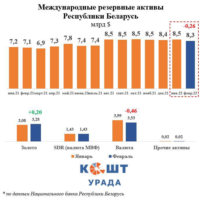 ЗВР Беларуси на 1 марта 2022 года составили $8,3 млрд. За февраль они снизились на $259,2 млн или на 3%. Нацбанк прямо пишет, что это произошло из-за того, что пришлось продавать валюту для поддержки рубля и платить по долгам. Резервы не спас даже рост цен на золото на 8%.