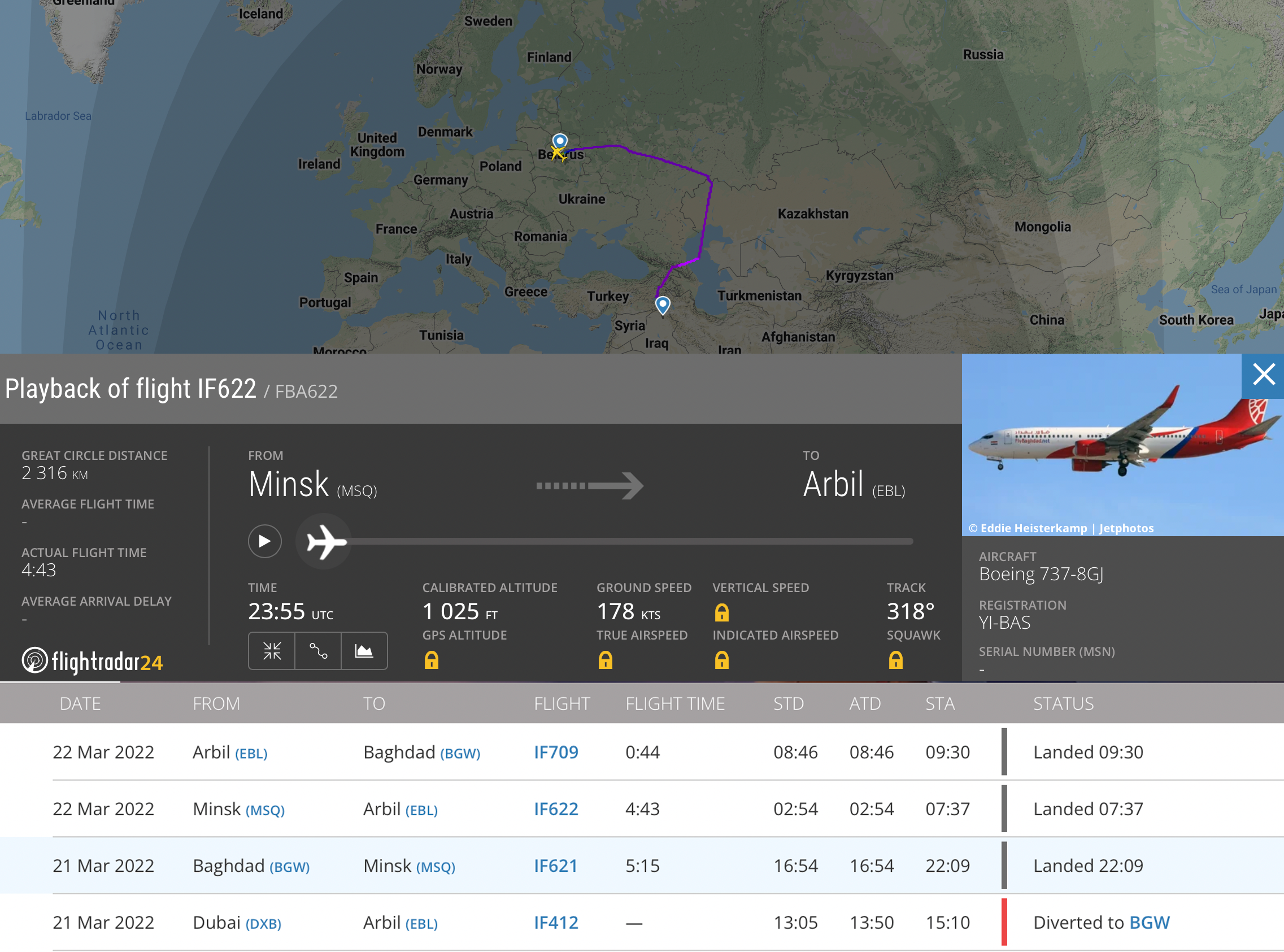 Вечером, в MSQ из Багдада (Ирак) прилетел Boeing 737-8GJ авиакомпании Fly Baghdad c рег.номером YI-BAS. Примечательно, что на сайте MSQ этого борта в расписании прилётов не было, ранее, их самолётами в Беларусь прилетали мигранты.