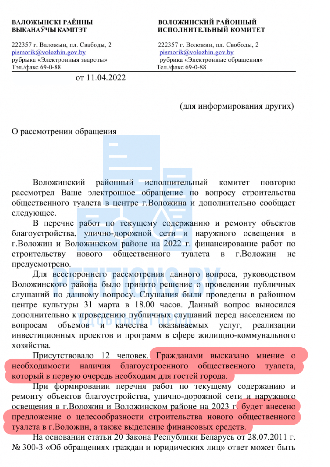 И вот, 11 апреля, просьбы горожан были услышаны. Заместитель председателя Воложинского райисполкома Протас Д.М. в ответе на петицию сообщил, что при формировании перечня работ по текущему содержанию и ремонту объектов благоустройства, улично-дорожной сети и наружного освещения в г.Воложин и Воложинском районе на 2023 г. будет внесено предложение о целесообразности строительства нового общественного туалета в г.Воложин, а также выделение финансовых средств.