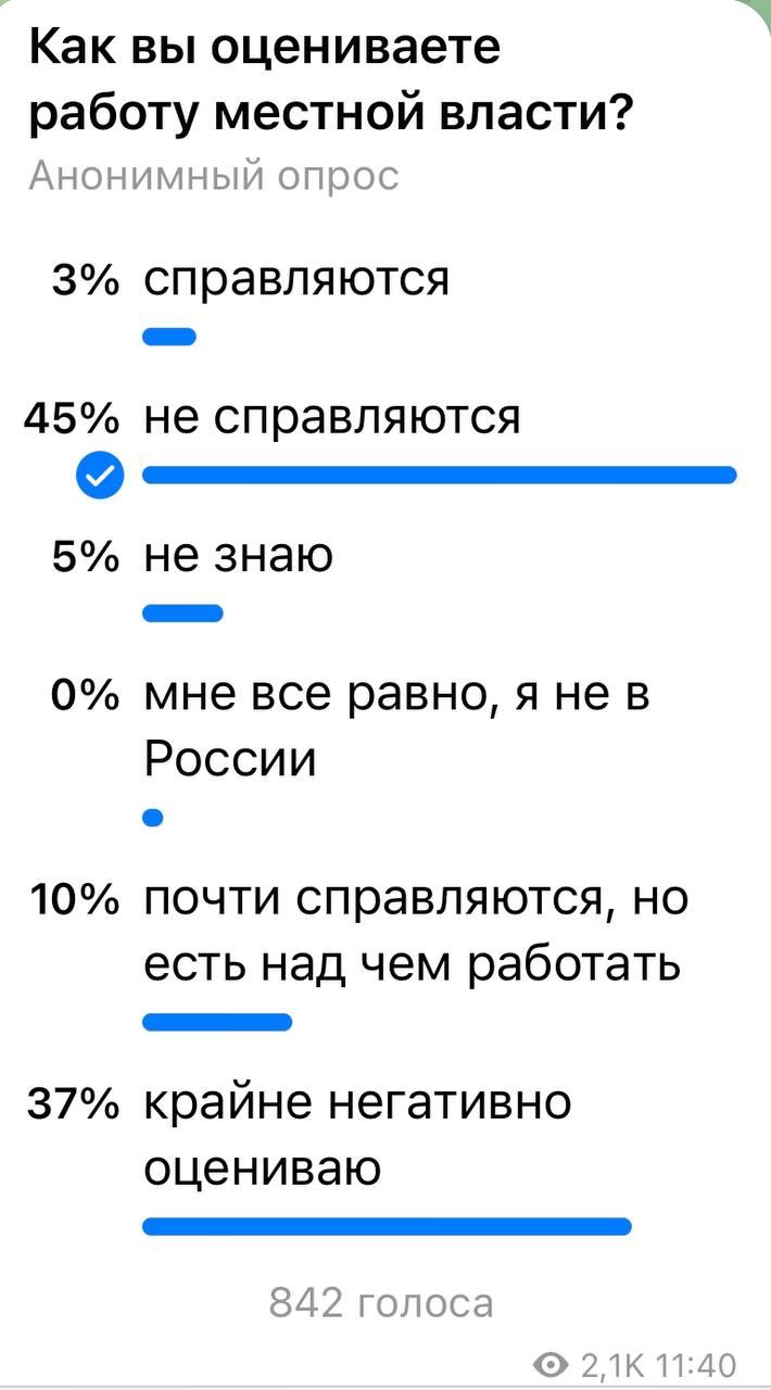 Прошел опрос об оценке работы местной власти. Из 2100 человек проголосовало 842 человека. Оценка негативная в целом: 45% не справляются, 37% крайне негативно оценивают работу властей. Почти позитивно и позитивно высказались: 10% почти справляются со своими обязанностями и 3% справляются.