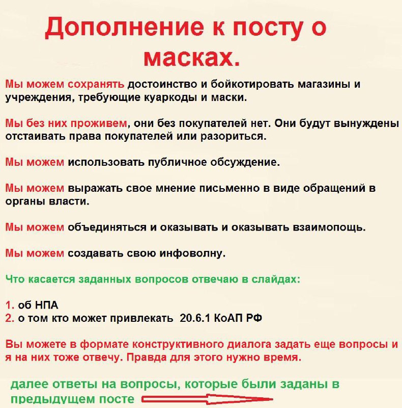 Мы можем сохранять достоинство и бойкотировать магазины и учреждения, требующие куаркоды и маски. Мы без них проживем, они без покупателей нет. Они будут вынуждены отстаивать права покупателей или разориться.