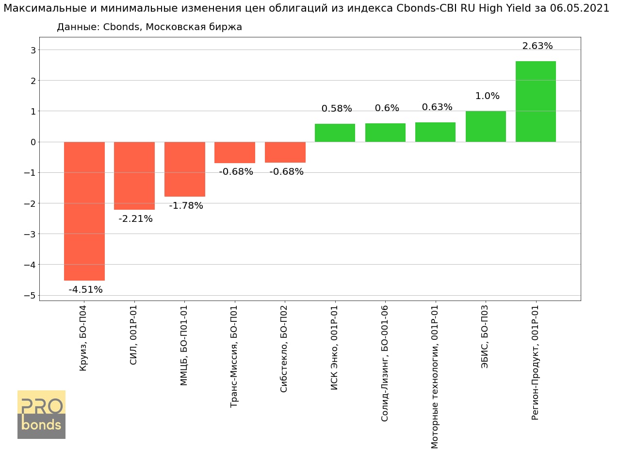 Максимальные и минимальные изменения цен облигаций из индекса Cbonds-CBI RU High Yield за 06.05.2021
