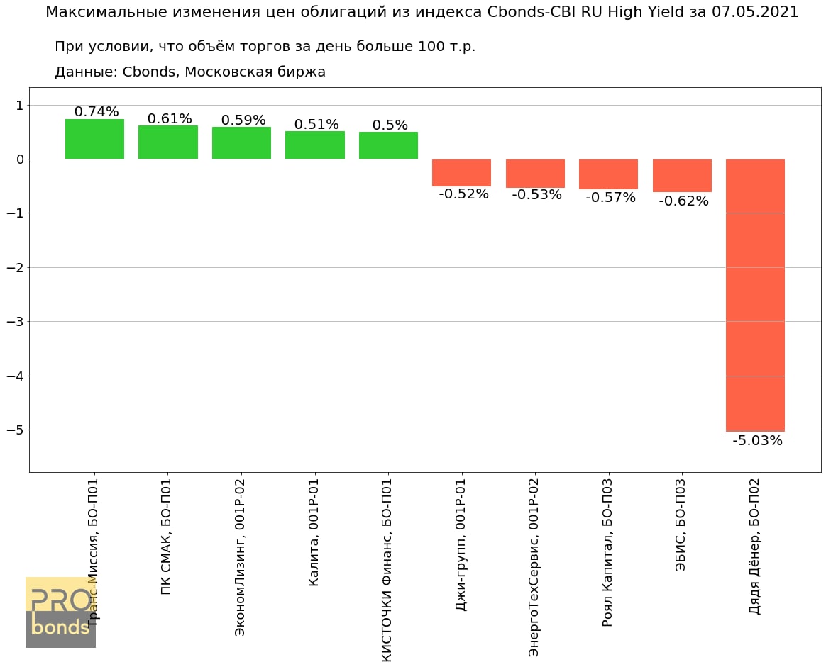 Максимальные изменения цен облигаций из индекса Cbonds-CBI RU High Yield за 07.05.2021