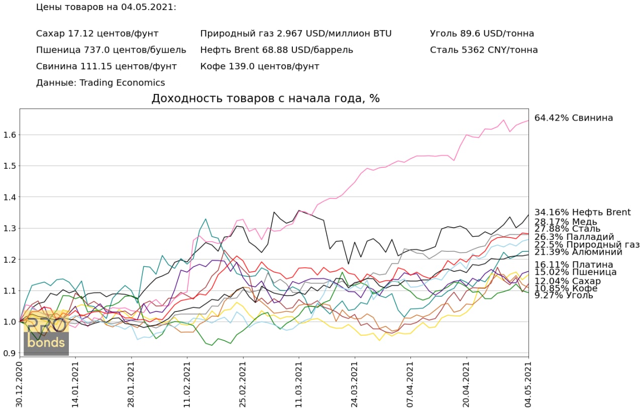 Так палладий, который используется в машиностроительной отрасли для снижения выбросов, бьёт рекорды в последние недели. Ключевые агрокультурные товары также стремительно растут, цена на кукурузу превысила 7$ за бушель впервые за 8 лет. Медь бьёт 10 летние рекорды, а бобы 8 летние. Индекс S&P GSCI, который отслеживает цены 24 видов сырья, вырос с начала года на 24%