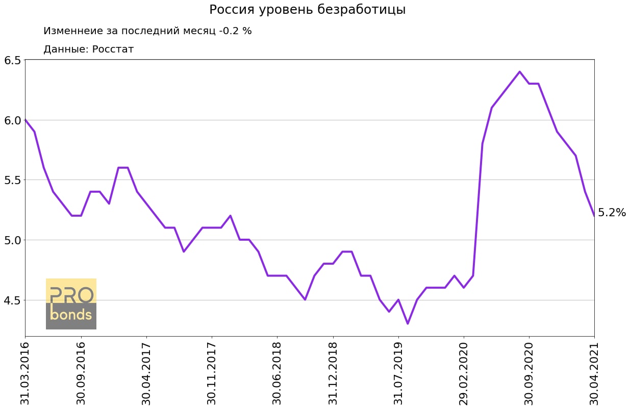 ​​Уровень безработицы в апреле 2021 г. снизился на 0,2 п.п. и составил 5,2%