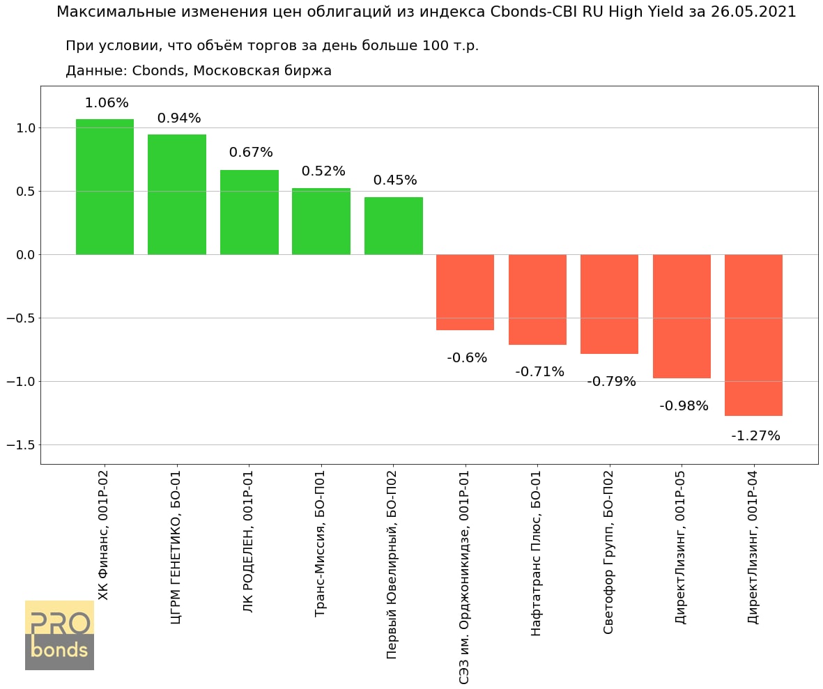 ​​Максимальные изменения цен облигаций из индекса Cbonds-CBI RU High Yield за 26.05.2021