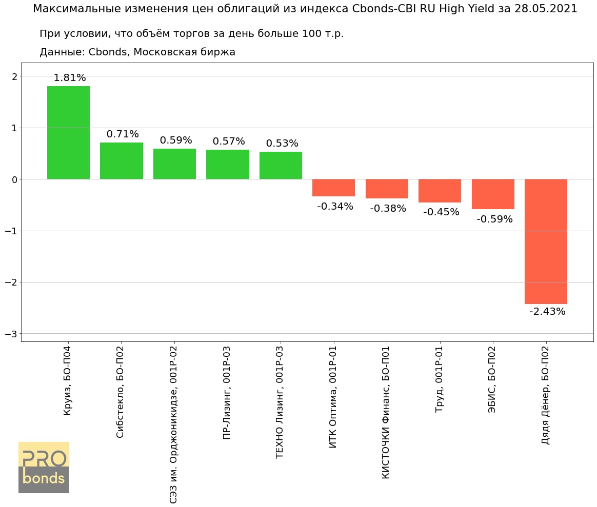 ​​Максимальные изменения цен облигаций из индекса Cbonds-CBI RU High Yield за 28.05.2021