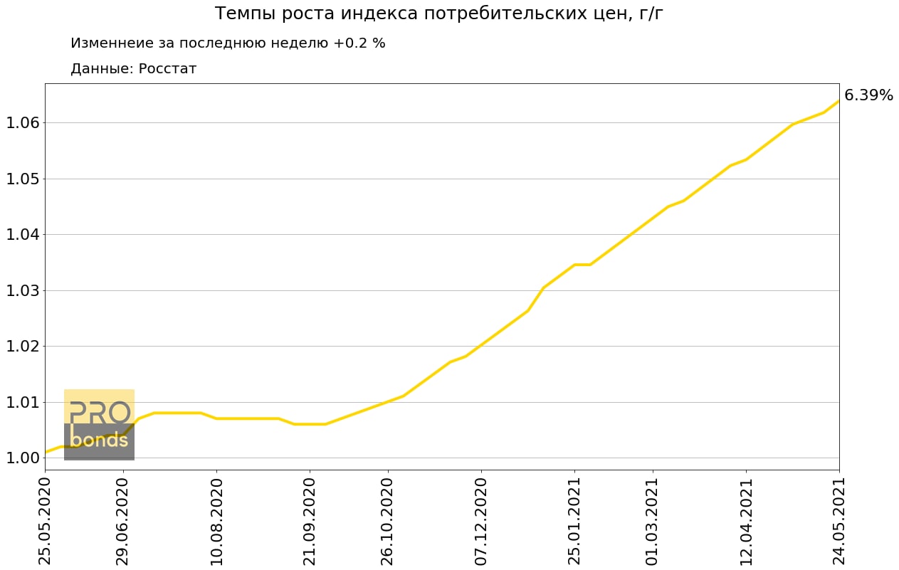 ​​За период с 18 по 24 мая 2021 г. индекс потребительских цен, по оценке Росстата, вырос на 0,2 п.п., с начала мая на +0,5 п.п., с начала года +3,2 п.п. (справочно: май 2020 г. +0,3 п.п., с начала года +2,4 п.п.)