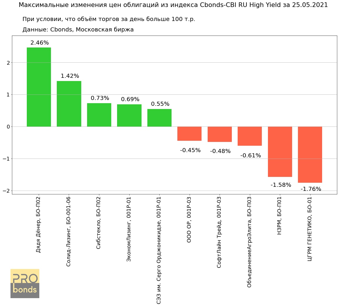 ​​Максимальные изменения цен облигаций из индекса Cbonds-CBI RU High Yield за 25.05.2021