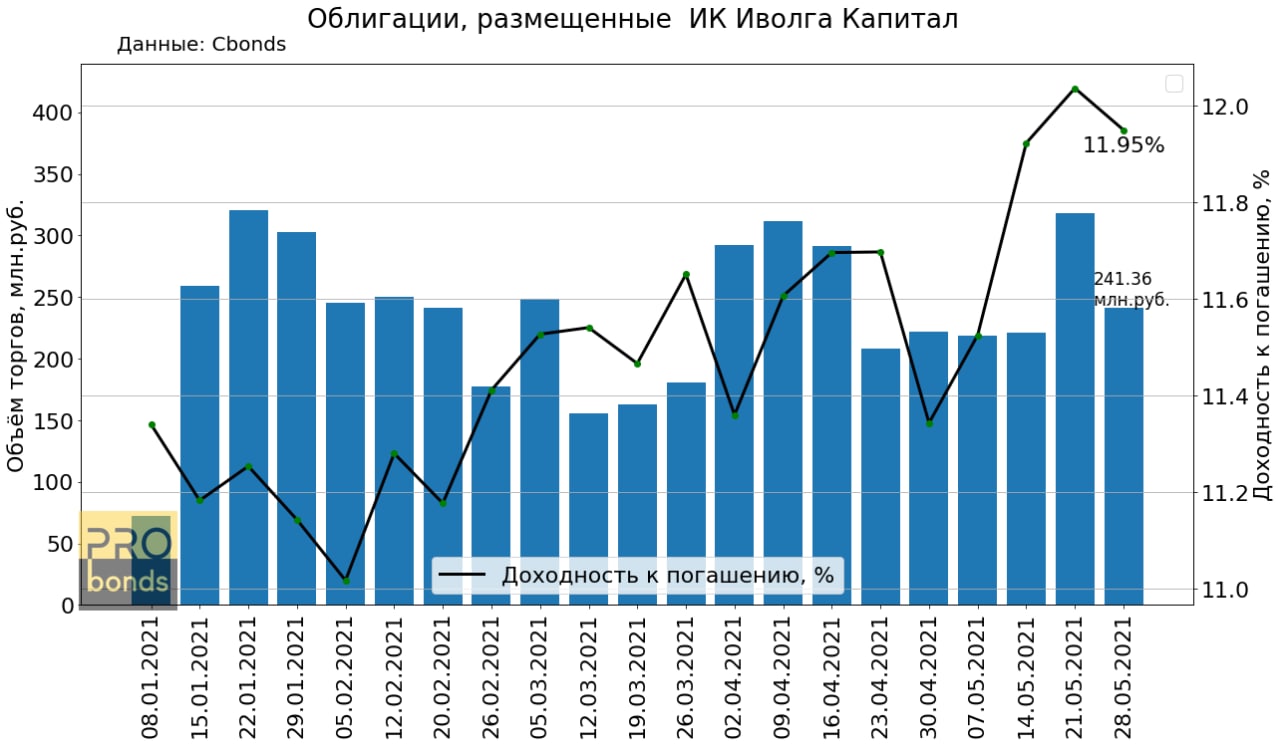 Торговый оборот облигаций, размещённых ИК Иволга Капитал, за прошедшую неделю составил 241.36 млн.руб. (-24.14% н/н)