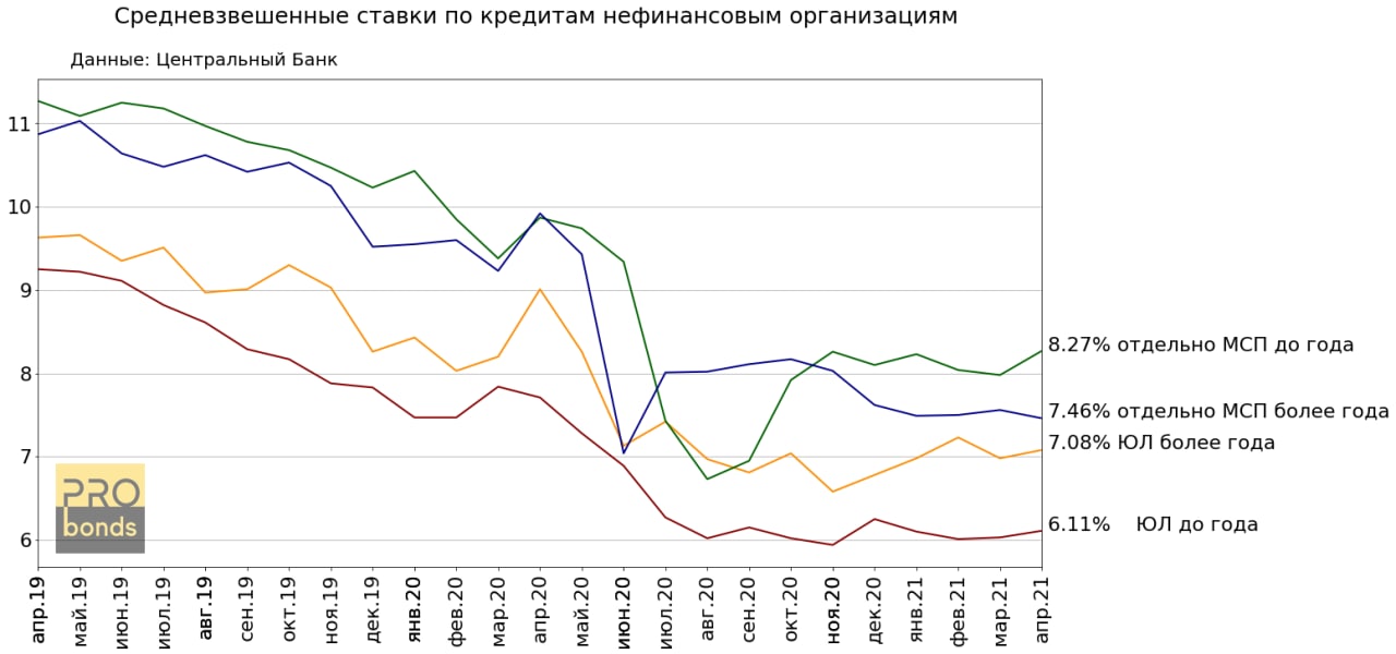 Данные ЦБ по средневзвешенным ставкам для юридических лиц в апреле
