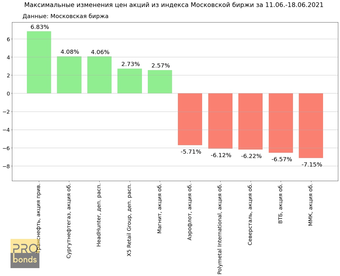 Максимальные изменения цен акций из индекса Московской биржи за 11.06.-18.06.2021