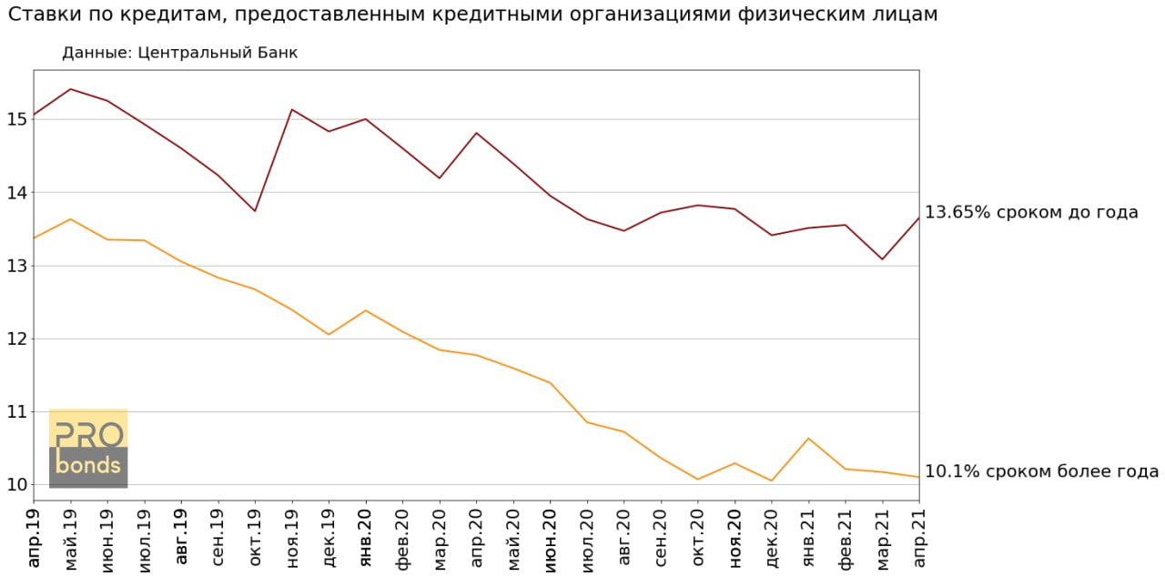 За апрель средневзвешенные по кредитам для физических лиц сроком до года выросли на +0.57 п.п. до 13.65%, более года снизились -0.07 п.п., до 10.1%