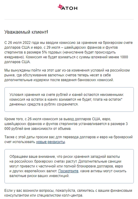 ​​⚡️«Атон» введет комиссию за хранение валюты на брокерском счете