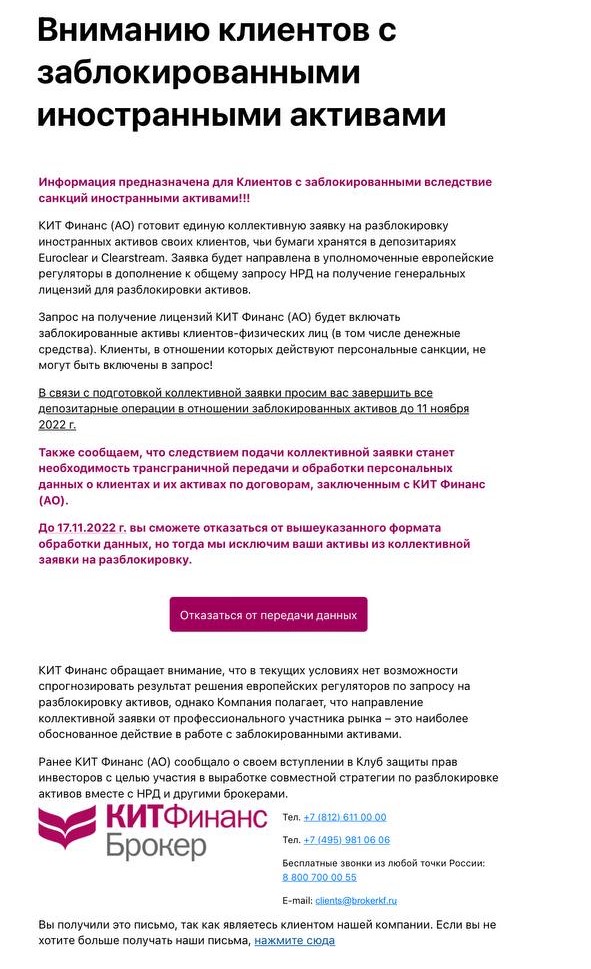 Об этом говорится в клиентской рассылке брокера (есть у «РБК Инвестиций»). Для того, чтобы компания направила обращение в органы ЕС, клиенты «КИТ Финанс» должны завершить все депозитарные операции в отношении заблокированных активов до 15 ноября. Ранее о подготовке подобных заявок заявили «Тинькофф Инвестиции», «Финам» и БКС.
