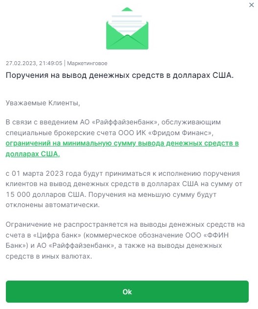 «С 1 марта 2023 года будут приниматься к исполнению поручения клиентов на вывод денежных средств в долларах США на сумму от $15 тыс. Поручения на меньшую сумму будут отклонены автоматически», — сказано в письме.