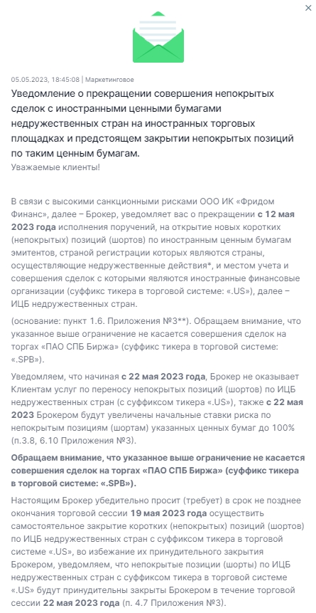 «Цифра брокер» предложил клиентам самостоятельно закрыть короткие позиции по иностранным ценным бумагам с суффиксом «.US» не позднее окончания торговой сессии 19 мая. В противном случае они будут закрыты принудительно 22 мая.
