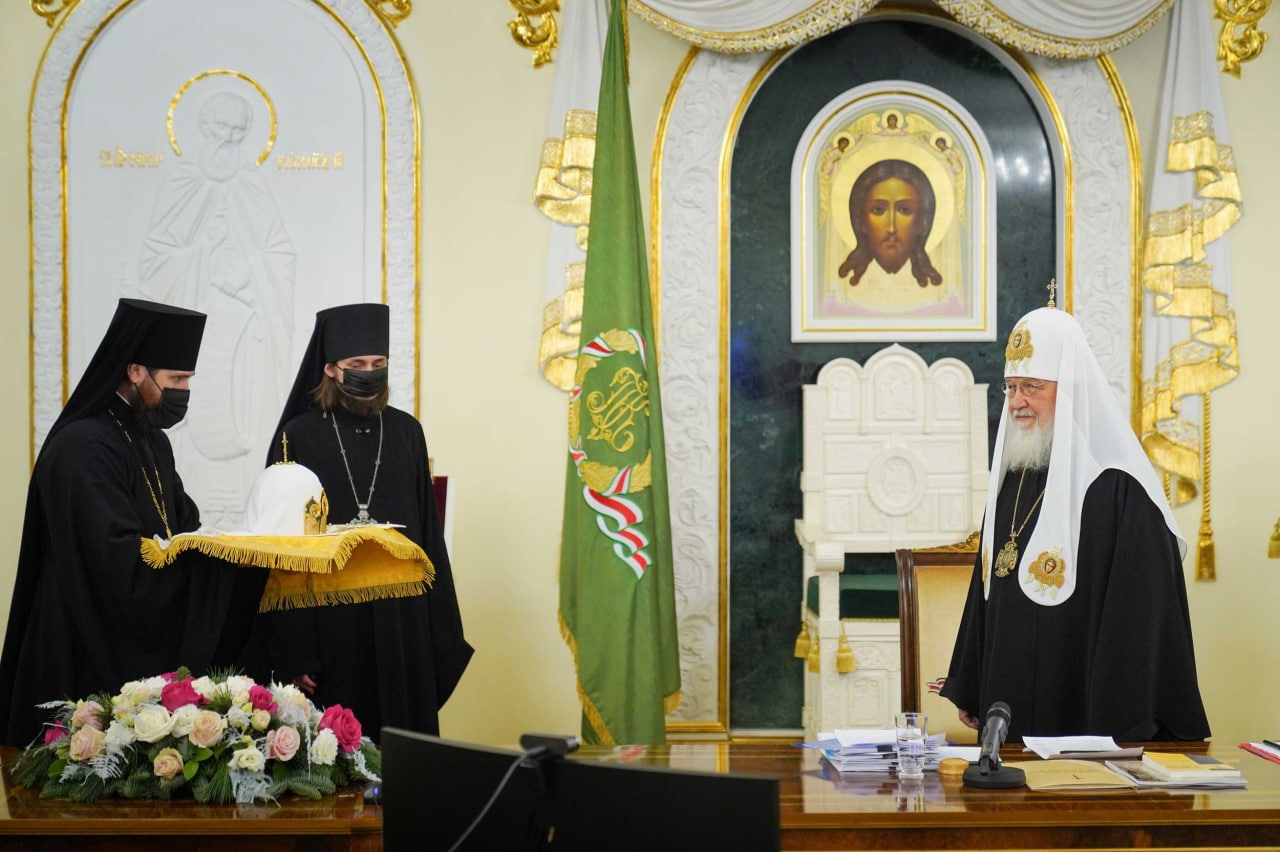 На фото: члены Синода поздравляют Кирилла с 75-летием, вручая ему новый куколь (монашеский головной убор).