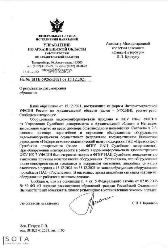 В документе, полученном адвокатом Крикуном, говорится, что неполадки были не у самой колонии, а у подрядчика — «Ростелекома».