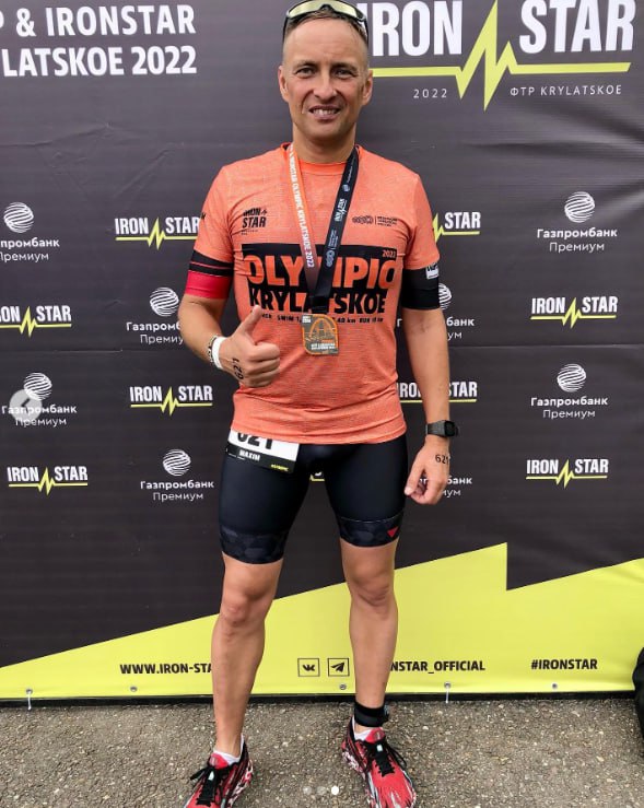 🟣 с медалью на фоне пресс-волла Iron Star с логотипом одного из спонсоров – подсанкционного «Газпромбанка» (см. фото);