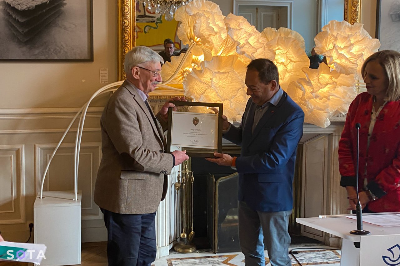 На фото: сопредседатель правозащитного общества «Мемориал» Олег Орлов становится почётным гражданином Парижа.