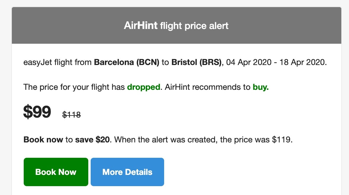 Вероятность изменения цены отображается в виде процентов и в большинстве случаев (82% для авиакомпании Ryanair) они выбирали именно тот момент, когда билет взять дешевле всего. Если вы не можете следить за динамикой изменения цены, оставьте свой e-mail и вам отправят соответствующее уведомление-рекомендацию "покупай сейчас".