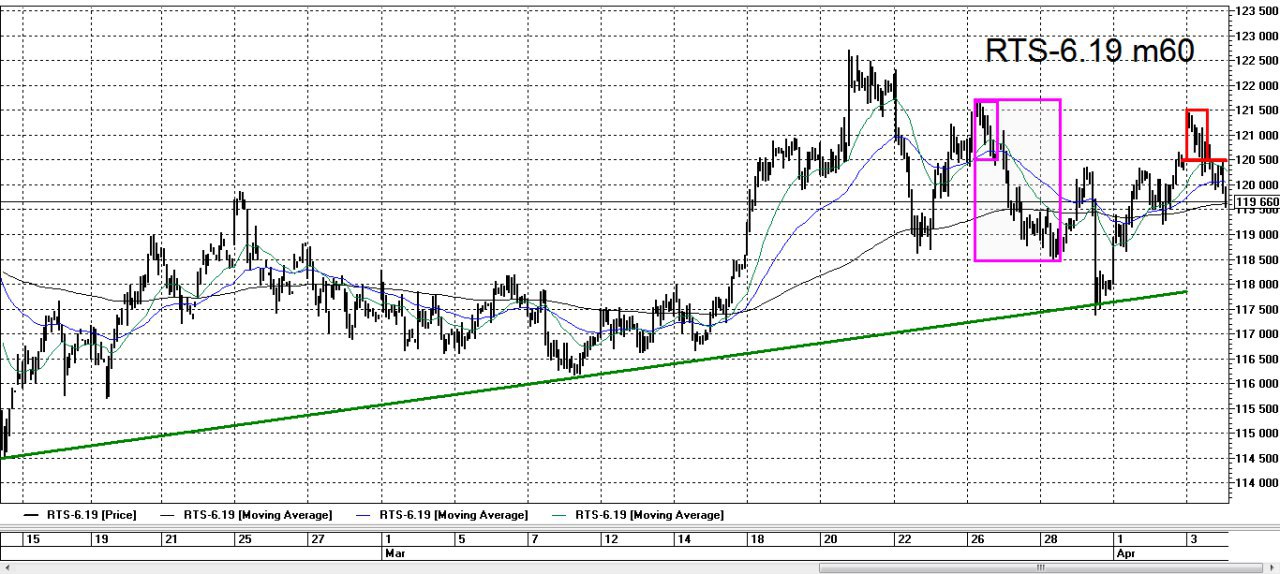 Фьючерс на индекс РТС преодолел вниз уровень 120000 который мог стать поддержкой для продолжения повышательного движения. В настоящее время ситуация для принятия каких-либо решений, на наш взгляд, нейтральная. Исходя из этого, рационально будет дождаться окончания консолидации цены инструмента на текущих уровнях и по факту выхода из проторговки в какую-либо сторону принимать решение о сделках.