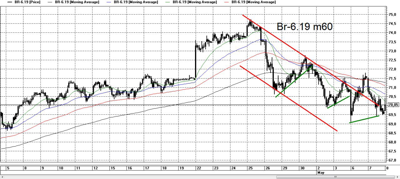 Фьючерс на нефть сорта Брент преодолел вниз уровень 71 доллар за баррель, от которого начиналась складываться поддержка с 26.04.19.