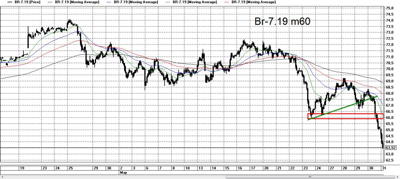 Ближайшим сопротивлением в настоящее время является уровень 72 доллара за баррель, от которого снижение цены усилилось. Соответственно, с “медвежьей” точки зрения”, снижение может быть продолжено и ближайшей целью в этом случае выступит уровень, который соответствует 100% размерности снижения цены инструмента с 25.04.19 по 06.05.19., то есть цена будет стремиться к уровню 68 долларов за баррель.