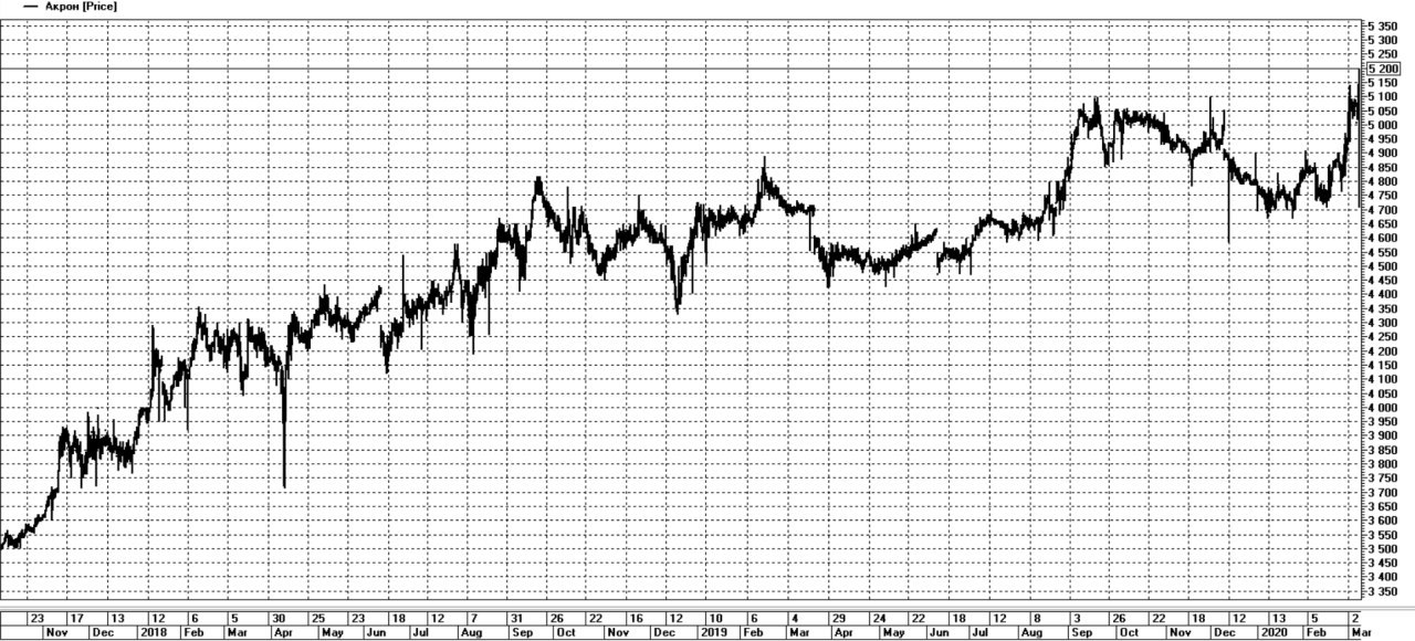 Акции ПАО Акрон. Мы обратили внимание на эти акции 18.02.20 с точки зрения привлекательности для получения доходности в пределах выплачиваемых компанией дивидендов, предположив, что ввиду близкой даты закрытия реестра акционеров (22.03.20), к данному активу будет повышаться интерес у участников рынка. Напомним, ожидаемый размер дивидендов составляет 145 рублей на акцию.