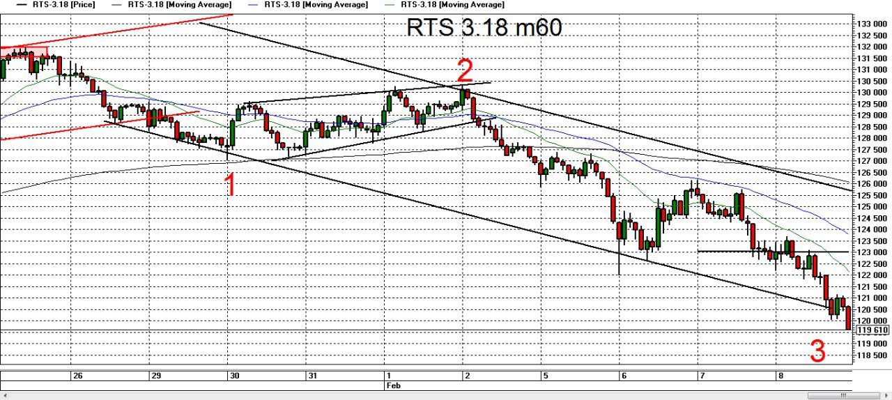 ИНФОРМАЦИЯ ПЕРЕД НАЧАЛОМ ТОРГОВ. RTS от максимумов снижался двумя импульсами 1 и 3. На текущий момент наблюдается перепроданность. Короткие позиции рекомедуется закрыть. Отскок ожидаем в район 123000 пунктов. Реализовать идею отскока во фьючерсе RTS , не выставляя стоп-заявок можно купив фьючерс и опцион Put страйка 120000 с экспирацией 15.03.18. При достижениии уровня 123000 рекомендуется закрыть эту позицию.