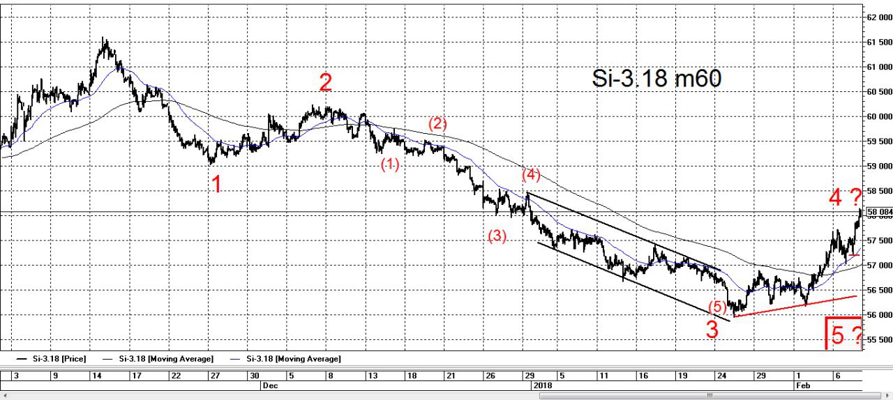 Сегодня немного пофантазируем по поводу USDRUB. Для анализа текущей ситуации предлагается график фьючерса Si-3.18 m60. Если следовать волновым принципам, то один из вариантов развития событий представляется следующий. Снижение с 15.11.17 по 27.11.17 было первой импульсной фазой снижения, затем до 11.12.17 была коррекция к первому импульсу, затем началась самая сильная импульсная фаза снижения, пресловутая "третья волна" вплоть до25.01. Сейчас же мы можем видеть коррекционное движение вверх, называемой 4-ой волной. Но не факт, что она завершилась. Если это предположение верно ( и "закон волн" работает) )), то нас может ожидать движение вниз с пробитием минимумов. Но все будет решаться на отметке 56500 - 57000. Это не руководство к действию, а один из вариантов.