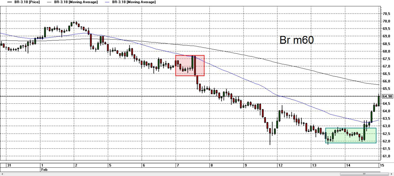 ТЕКУЩИЙ МОМЕНТ. Фьючерс на нефть впервые за период с 25.01.18 сформировал и преодолел фрактал на покупку на уровне 63.00. Этот уровень на сегодня и является основной поддержкой. Сопротивление на уровне 66,50, где 07.02.18 начались активные продажи.