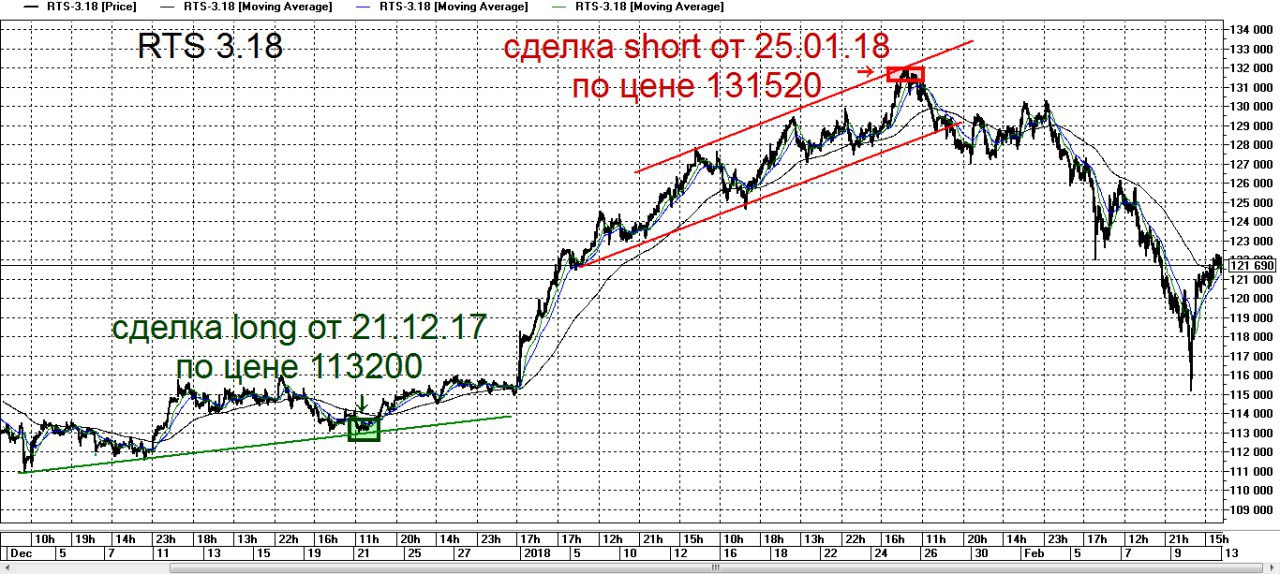 ТРЕНД ИЛИ КОНТРТРЕНД. ТОРГОВАЯ СИСТЕМА. А работает ли это в действительности? Хорошо ведь рисовать картинки и в левой стороне графика показывать как надо было бы сделать. Для ответа на этот вопрос обратимся к истории сделок , предложенных в режиме онлайн на этом канале. Мы увидим, что 21.12.17 была предложена покупка RTS 3.18 по цене 113200, затем 25.01.18 было предложено закрыть трендовую сделку в связи с развитием фигуры завершения тенденции и 25.01.18 было предложено открыть "шорт" по цене 131520 в связи с появлением разворотной формации. Все это можно увидеть в опубликованных здесь постах за означенные даты. То есть можно убедиться, что при должном подходе и определенном взгляде на принципы изменения цены заработок на рынке становится реальностью.