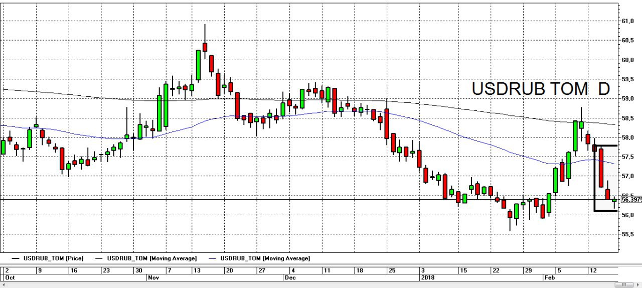 ТЕКУЩИЙ МОМЕНТ. Пара USDRUB оттолкувшись вниз от скользящей EMA200 продолжила нисходящее движение. Основной поддержкой на сегодня выступит уровень начала покупок от 02.02.18. Так как фьючерс на индекс РТС и пара USDRUB являются инструментами с обратной корреляцией, то при дальнейшем росте РТС следует ожидать новых минимумjв USDRUB.