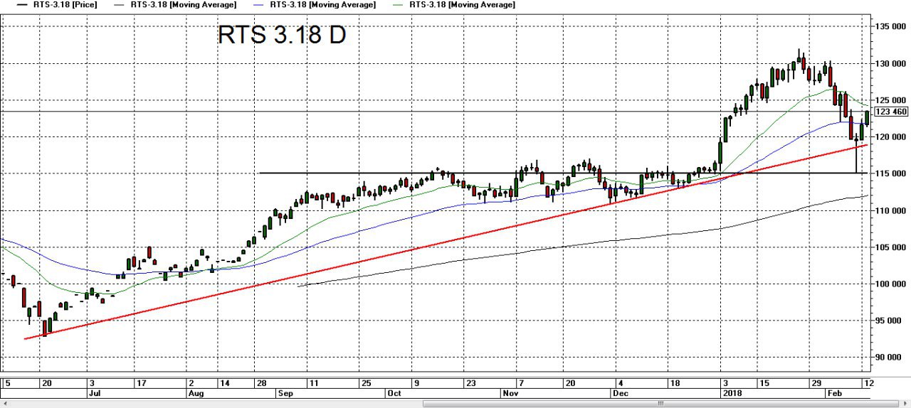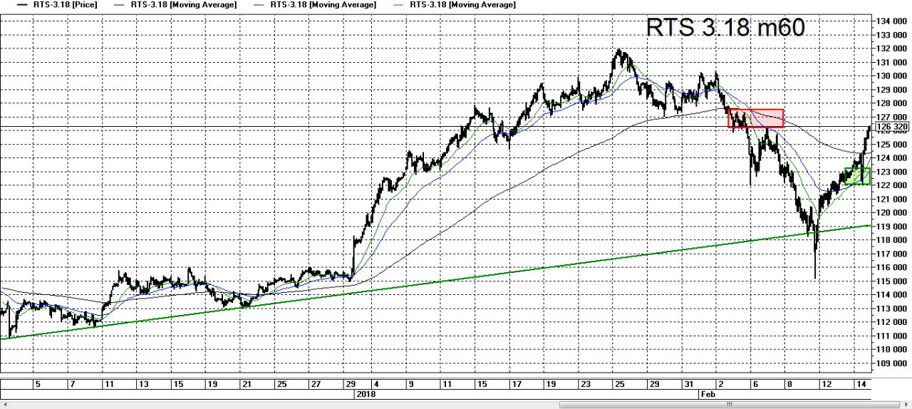 Наша сделка от 09.02.18 покупка RTS-3.18 по цене 120000 + PUT страйк 120000, экспирация 15.03.18 по цене 3500 ( общие затраты 120000 + 3500 = 123500) имеет текущий результат : RTS-3.18 цена 122700 + PUT цена 2100 ( 122700 + 2100 = 124800) Итого результат по сделке 124800-123500=1300.Что соответствует 1500 рублей на каждую пару фьюч+ пут. Учитывая, что гарантийное обеспечение по данной позиции было 4060 рублей на каждую пару фьюч+пут, текущая прибыль составляет 32% от затраченных средств на гарантийное обеспечение. Так как эта сделка подразумевала отскок по РТС рекомендуем закрыть все позиции по сделке.