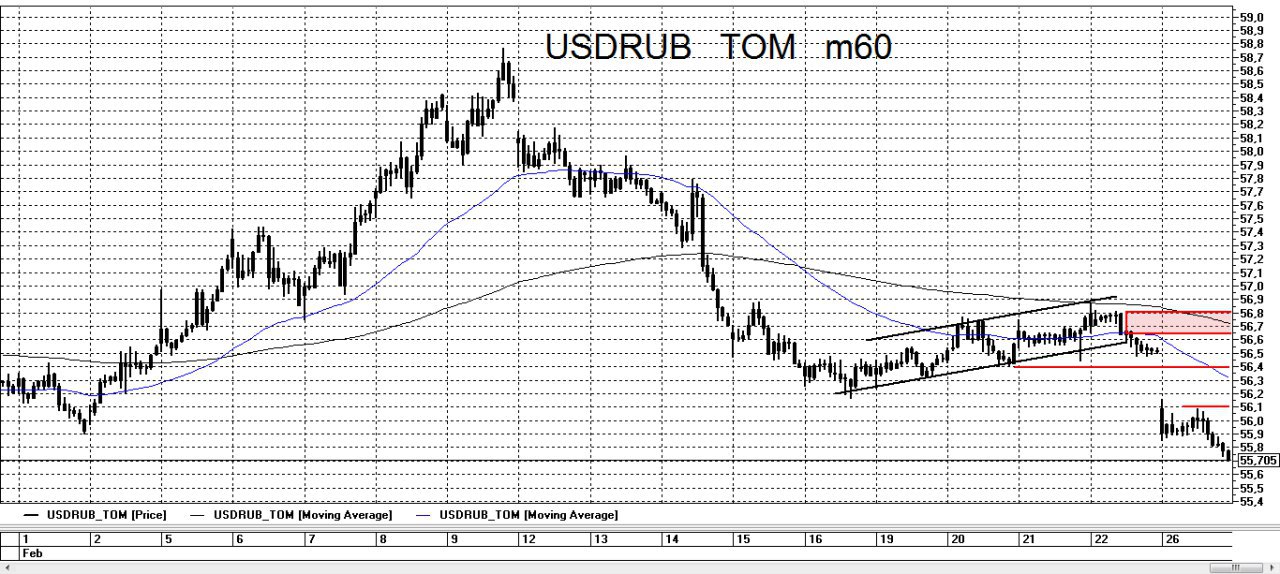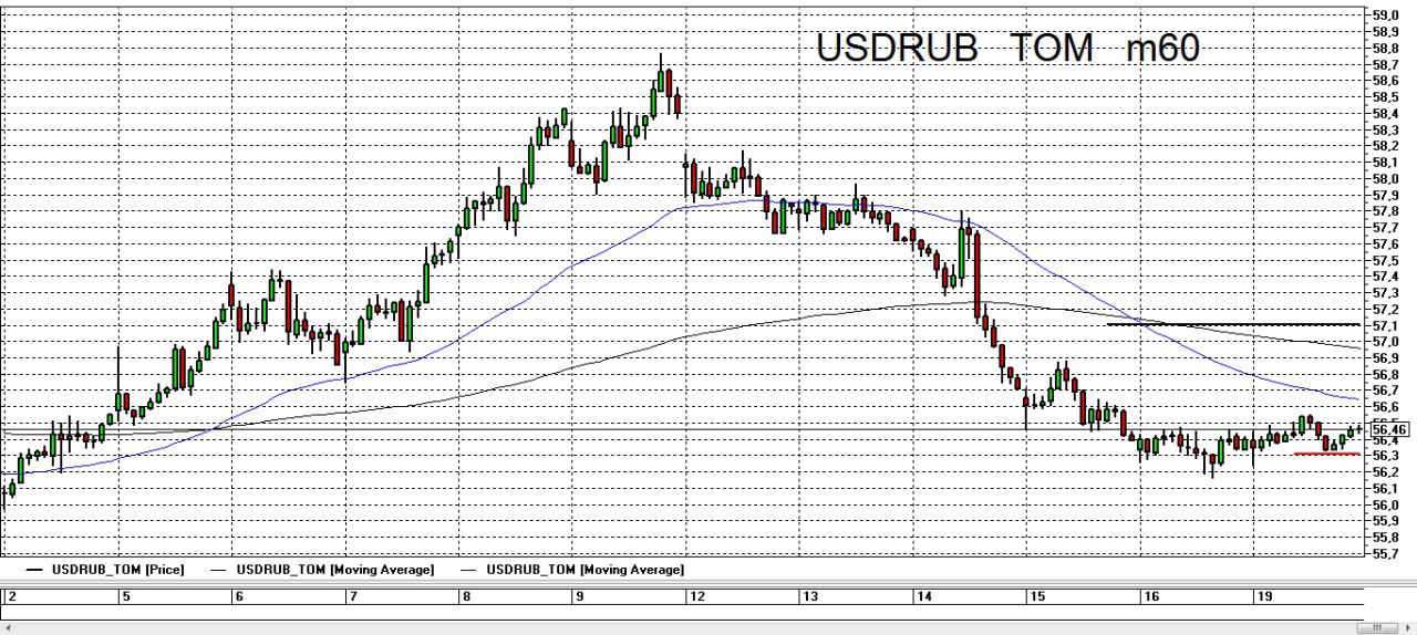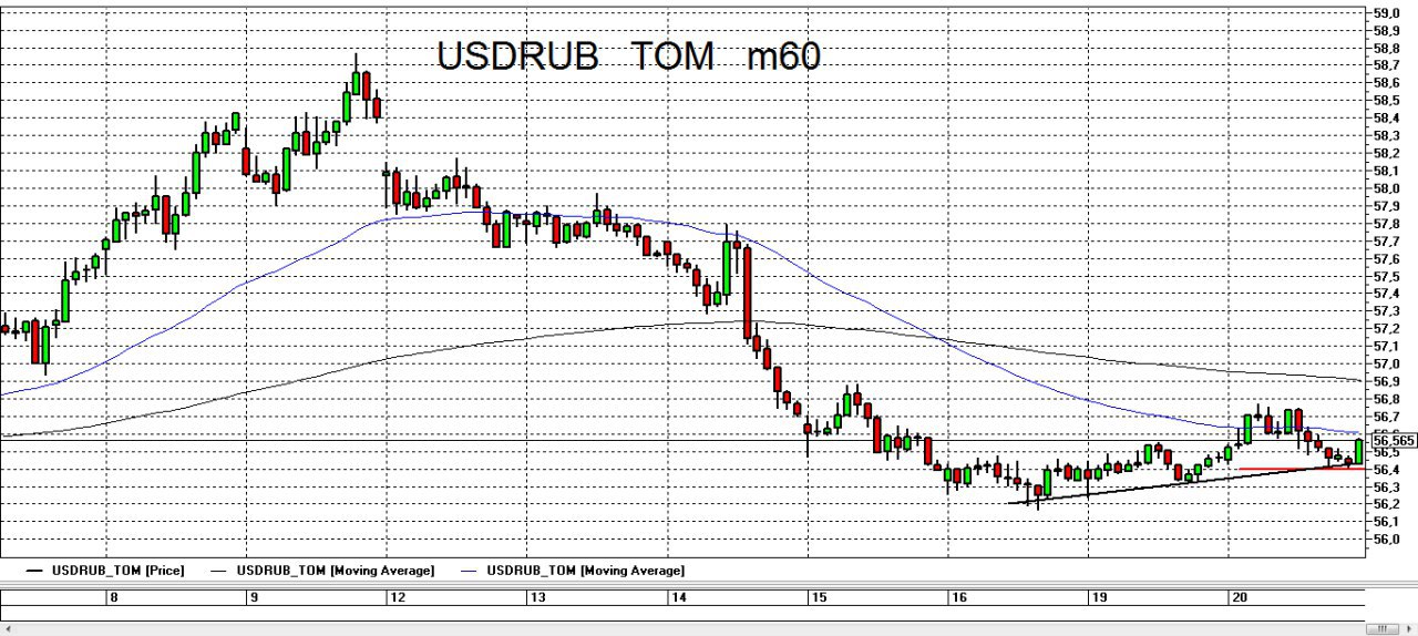 ТЕКУЩИЙ МОМЕНТ. USDRUB TOM. Пара USDRUB пытается начать коррекционное движение вверх по отношению к предыдущему падению. Целями отскока явится уровень цены 57.00 - 57.30. Ближайшей поддержкой для открытия длинных позиций является отметка 56.30.