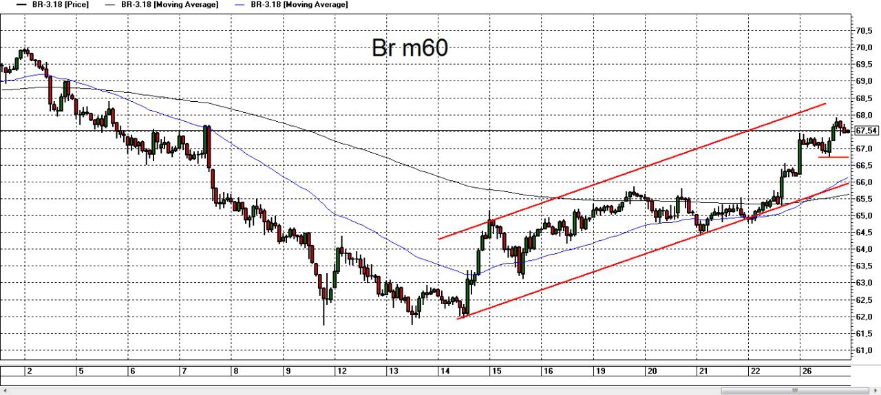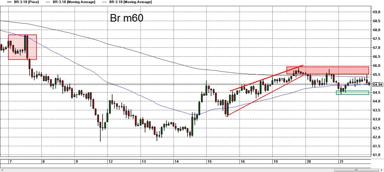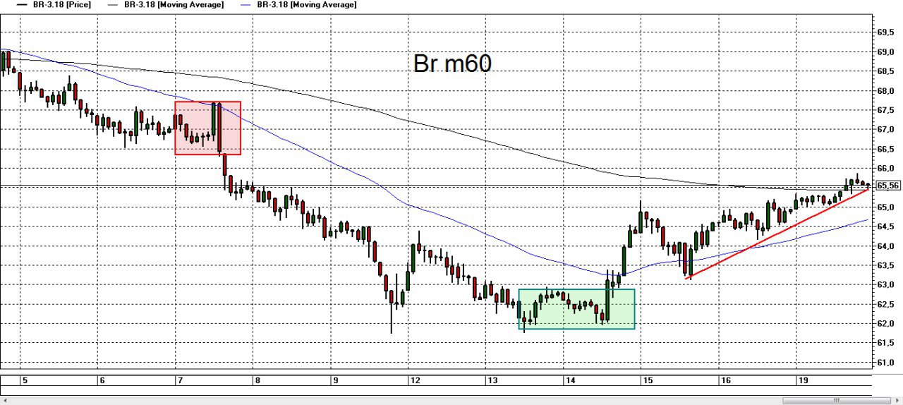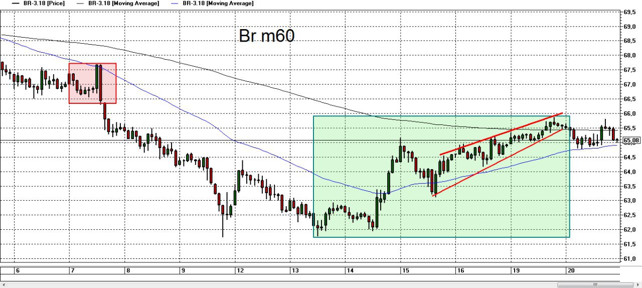 ТЕКУЩИЙ МОМЕНТ BR-3.18. Фьючерс BR-3.18 движется в восходящем ценовом канале. Основной поддержкой является уровень начала покупок 64.00, ближайшая поддержка для лонгов с идеей текущего восходящего тренда является отметка 65.00. В азиатскую сессию началось незначительное снижение котировок. Ближайшее сопротивление 65.80.
