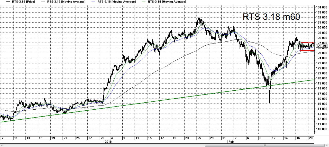 ТЕКУЩИЙ МОМЕНТ. RTS-3.18. Фьючерс на индекс РТС всю торговую ссесию 19.02.18 провел в консолидации в узком диапазоне, не попытавшись преодолеть максимум. Данный факт позволяет предположить, что фьючерс будет ниже. Спекулятивной поддержкой на сегодня является значение 125500, сопротивление и соответственно отменой сценария снижения в начале торговой сесси выступит уровень127500.