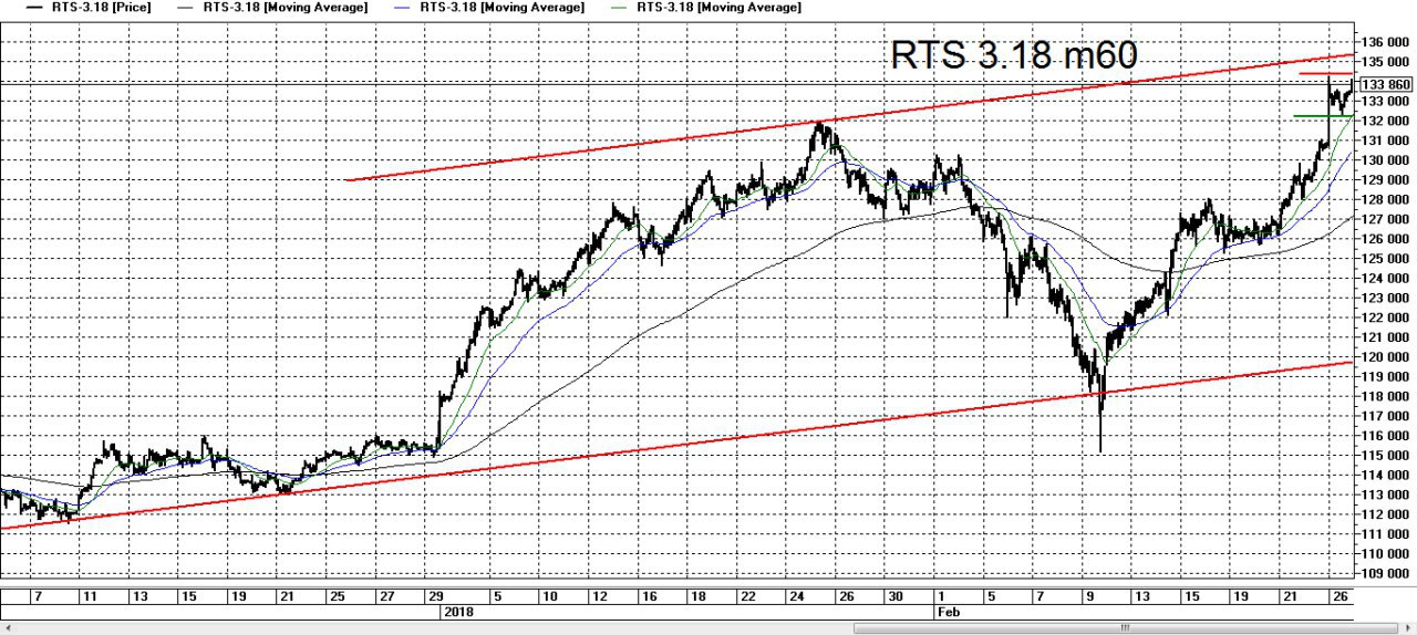 ТЕКУЩИЙ МОМЕНТ RTS-3.18. Фьючерс на индекс РТС вышел из зоны консолидации ввверх. Общее направление движения восходящее. Основным уровнем поддержки для открытия длинных позиций выступит отметка 127000 пунктов. Вместе с тем, при пробитии этой поддержки все движение вверх с 9.02.18 по 21.02.18 может оказаться коррекцией по отношению к падению с 25.01.18 по 9.02.18. Исходя из вышеизложенного открывать длинные позиции сегодня стоит учитывая основной спекулятивный уровень поддержки 127000 пунктов, а при открытии коротких позиций необходимо учесть, что сопротивлением на сегодня станет локальный максимум, сформированный на уровне 129800 пунктов.