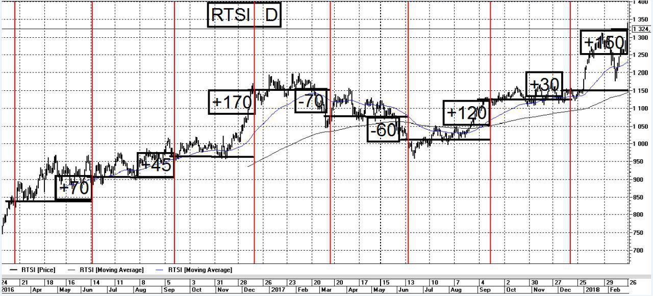 Посмотрим на график индекса RTSi и проанализируем величину изменения цены от одной квартальной экспирации до другой с начала 2016 года. Мы видим, что каждая последующая экспирация проходила с изменением цены от 30 до 170 пунктов ( это соответствует от 3000 до 17000 по фьючерсу на индекс РТС) в какую-либо сторону. Следовательно, чтобы нам стабильно зарабатывать, надо построить систему, от которой можно получать доход при изменении цены индекса на 30 пунктов(3000 пунктов фьючерса РТС) в любую сторону. На графике ниже вертикальными линиями обозначены приблизительные даты экспираций, а горизонтальными - ценовые уровни квартальных экспираций. Но при покупке опционов есть большпая проблема, а именно временной распад. Чтобы нивелировать этот негатив мы должны не только покупать, но и продавать опционы. Исходя из вышеизложенных условий наиболее оптимальным вариантом выглядит покупка волатильности в виде опционной конструкции, так называемая "продажа бабочки". Она состоит из опционов трех разных страйков и одной даты экспирации. Заключается в покупке двух опционов на центральном страйке и продаже по одному опциону страйком выше и ниже. Применяться могут опционы в разных вариациях: либо только Call-опционы, либо Put-опционы, либо комбинация Call, Put. Суть заключается в получении дохода при выходе цены базового актива за крайние цены-страйк. Максимальный доход получится, если на дату экспирации цена базового актива вышла за цены-страйк проданных опционов. Страйки опционов на фьючерс РТС расположены через каждые 2500 пунктов. Если взять квартальные серии опционов, то вероятность движения на 2500 пунктов в любую сторону, как мы выяснили очень высока, то есть статистическое преимущество получения дохода на нашей стороне. Осталось выяснить потенциальную доходность, гарантийное обеспечение и риски. Риски: риски будут ограничены итоговой суммой, уплаченной за покупку опционов за вычетом суммы, вырученной за проданные опционы. Максимальный риск будет достигнут при условии, что к следующей экспирации опционов (в нашем случае через квартал) цена базового актива будет именно на той отметке, на которой мы формировали оционную конструкцию, что маловероятно. Гарантийное обеспечение ( ГО): ГО на такую позицию очень маленькое и в частности по опционам на фьючерс на индекс РТС составляет окло 500 рублей на единицу квартальной конструкции. Но использовать 100% депозита под ГО категорически не рекомендуется. Доходность: максимальная доходность будет ограничена и составит около 200 рублей на единицу такой конструкции. С другой стороны максимальная доходность получается порядка 40% от гарантийного обеспечения. При условии, что грузить депозит под ГО не более 50%, предполагаемая доходность получается порядка 20% от депозита за квартал или 80% годовых, что весьма неплохо.