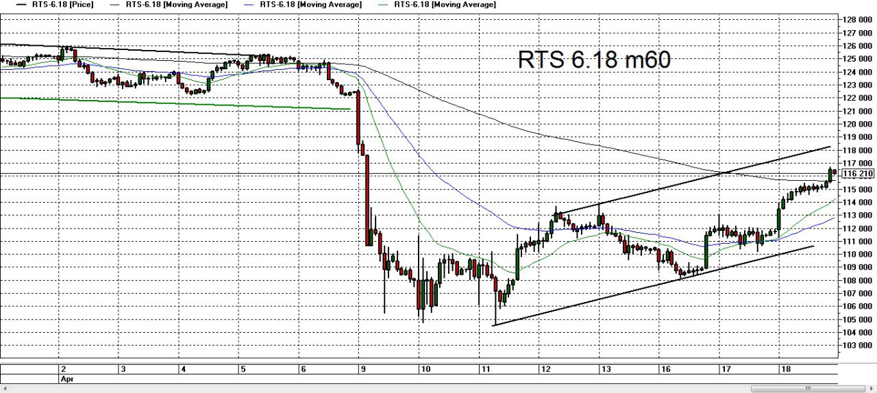 ​​ТЕКУЩИЙ МОМЕНТ. RTS-6.18. Фьючерс на индекс РТС после позитивного открытия торговой сессии 19.04.18 начал снижаться. тем самым обозначив локальный максимум на отметке 117760. На наш взгляд это снижение является коррекционым. На сегодняшний день актуален формирующийся восходящий ценовой канал от границ которого логично рассматривать варианты сделок. Основной поддержкой является уровень 108000, локальное сопротивление лежит на вчерашнем максимуме 117760. . #фьючерсы #трейдинг #RTS. Торгуйте вместе с нами: https://o-n-i-s.ru/torghuiem_vmiestie