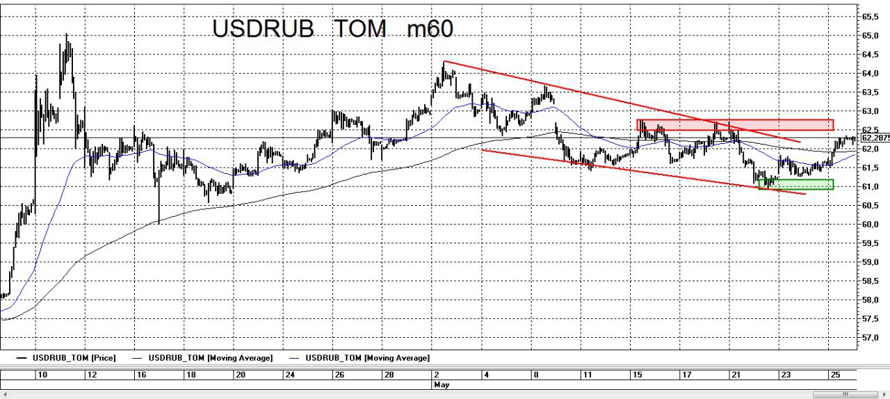Валютная пара USDRUB торгуется в восходящем ценовом канале. Ближайшая поддержка для продолжения движения цены инструмента вверх, именно в текущей конфигурации, является отметка 62.20. Но увеличивающаяся волатильность на верхней границе текущего тренда может говорить о формировании фигуры завершения тенденции и пересмотре своих настроений участниками рынка. Общая ситуация по инструменту, отмеченная нами во вчерашнем обзоре не меняется.