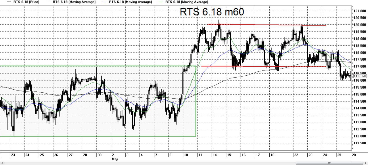 Фьючерс на индекс РТС отрабатывает проторговку диапазона 117000 - 120000. От 119900 до 118600 было импульсное движения вниз, следовательно, стоит ожидать, как минимум ещё одно аналогичное по размеру движение вниз, по завершению которого возможен ещё один заход вверх.