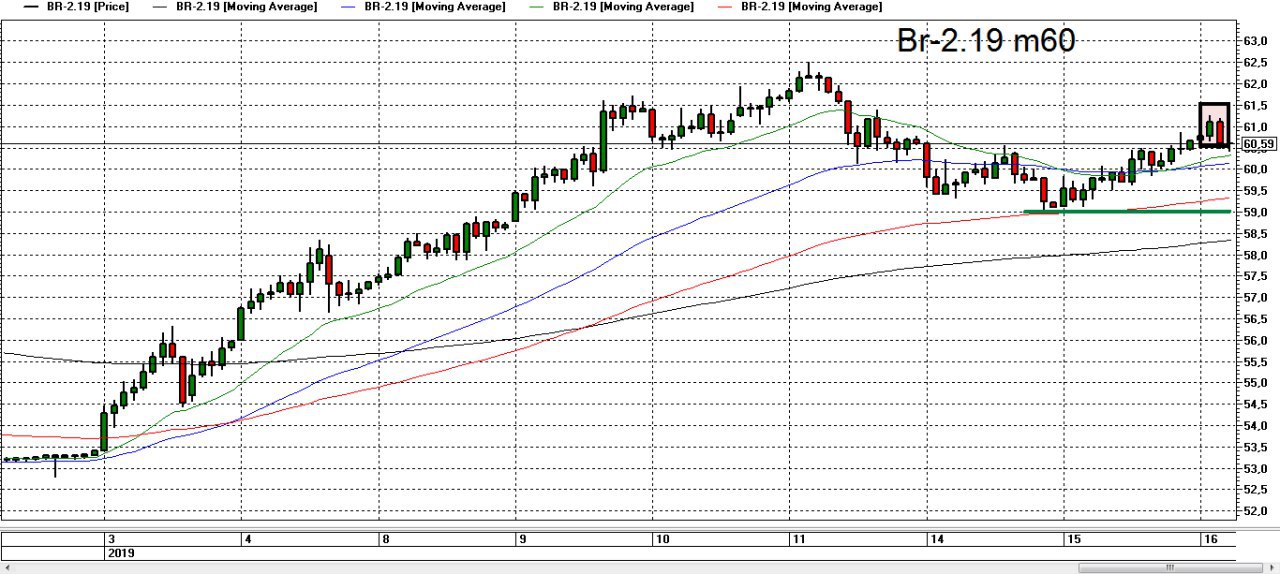 Фьючерс на нефть сорта Брент преодолел вверх ту “медвежью” модель, о которой мы говорили вчера. Но надо сказать, что небольшое движение вниз после этой модели все же было и оно дало возможность всем желающим, открывшим короткие позиции по этому паттерну выйти из сделки безубыточно или с небольшим риском. На сегодняшний день по итогу первого часа торгов на Московской бирже вновь формируется локальная “медвежья” модель и соответствующее сопротивление на отметке 61.50, при реализации которой возможно движение вниз. Вместе с тем, как ближайшая поддержка, пока видна линия повышательного движения, берущая свое начало от отметки 59,00. От этих значений на сегодня можно выстраивать тактику работы.